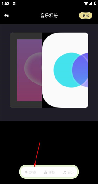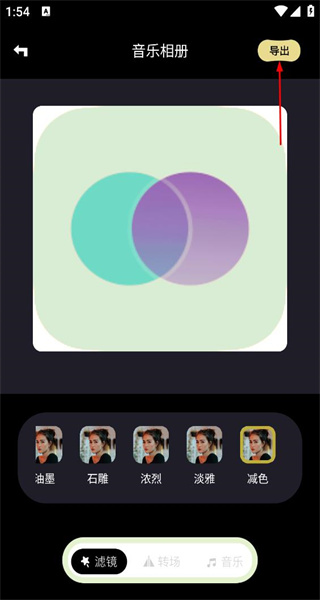 4、完成滤镜等设置后,选择右上角导出按钮,将制作好的音乐相册导出保存。