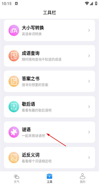 1、打开软件后,进入工具栏页面,含大小写转换成语查询答案之书等功能,选择谜语选项进入对应板块页面。