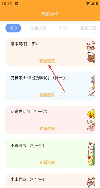 2、进入谜语大全页面默认显示字谜分类,列出独眼鸟党员带头等字谜题目,选择对应题目旁的查看谜底按钮。