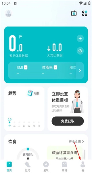 1、打开软件后,显示体重数据区域及BMI等选项,趋势板块旁有设置体重目标入口,点击我进入我的页面。
