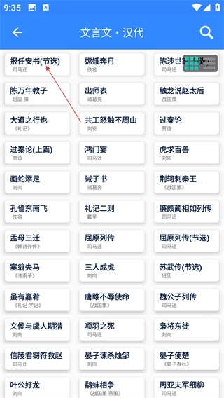 3、在汉代文言文列表页面,点击【报任安书(节选)】,进入该文言文详情页面。
