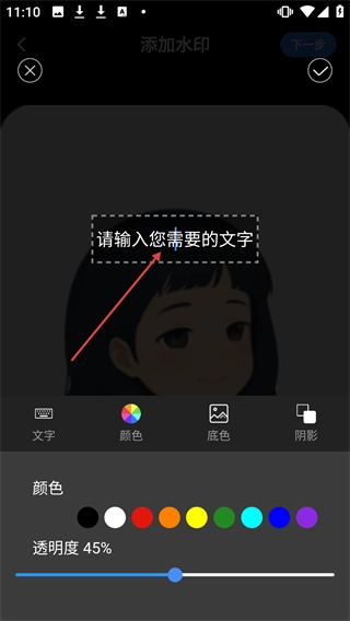4、在文字输入框中输入所需文字,可对颜色、透明度等参数进行调整,设置完成后确认即可。
