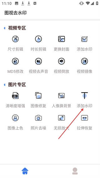 1、在图视去水印应用的功能页面中,找到【图片专区】里的【添加水印】功能选项,点击该选项即可进入添加水印的操作流程。
