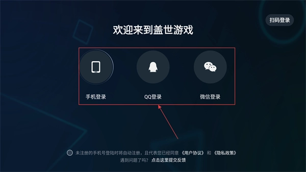 1、进入盖世游戏界面,选择登录方式,进行登录。