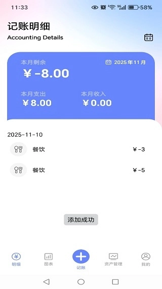 4、记账成功后,系统会有提示,还能在明细页面查看到。