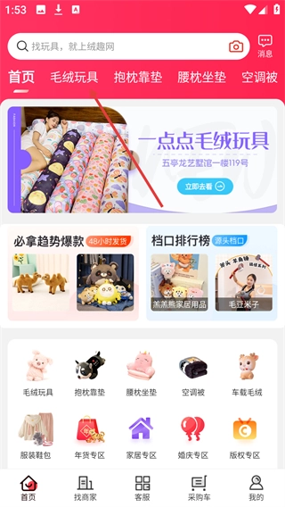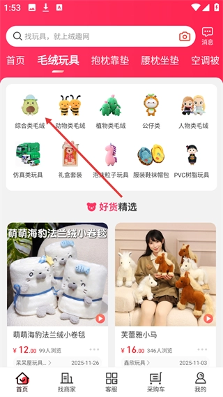 1、点击顶部的【毛绒玩具】分类,进入该品类的细分页面后,就能看到各种不同类型的毛绒玩具选项。