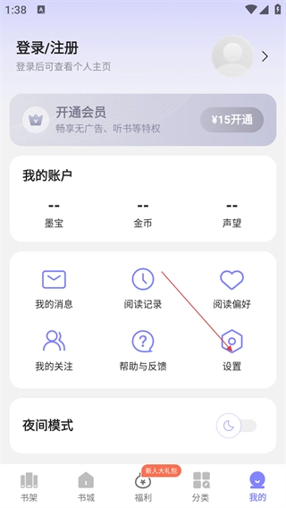 1、进入贤读小说应用后,点击底部导航栏的【我的】选项,即可进入个人中心页面,在该页面能找到登录、设置等功能入口。