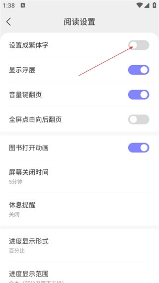 4、在【阅读设置】页面,可开启【设置成繁体字】等功能,个性化调整阅读体验。