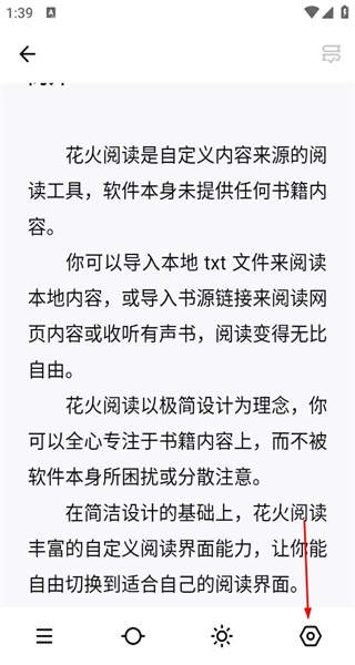 1、启动花火阅读应用,界面会呈现软件的相关介绍,其中说明该软件具备自定义内容来源等特性,界面底部设有功能按钮,点击“设置”按钮即可进入对应的设置页面。