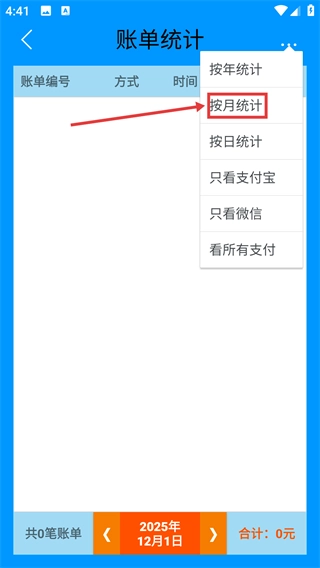3、在菜单里找到【按月统计】选项并点击,这样就能切换到按月维度的账单统计界面,进而查看每个月的交易数据。