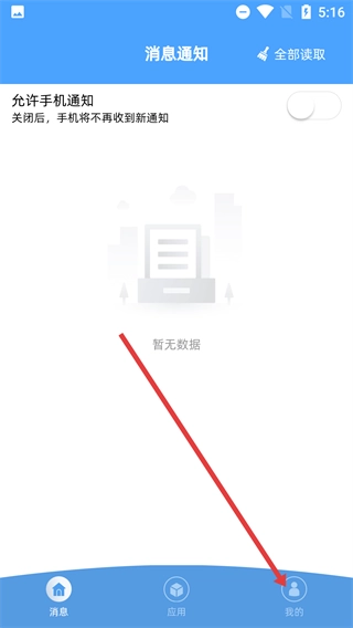 在【消息通知】页面,你可以开启或关闭【允许手机通知】功能,点击【全部读取】来管理通知,也能借助底部的【我的】按钮切换页面。