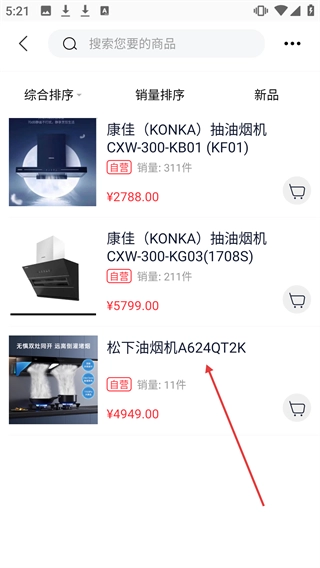 3、在油烟机商品列表里点击【松下油烟机A624QT2K】,就能进入该商品的详情页面。