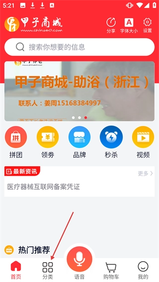 1、在【甲子商城】首页点击【分类】按钮,就能进入商品分类页面。