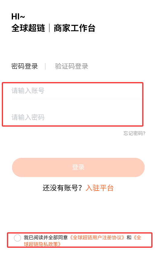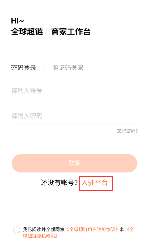 1、打开后,在登录页面找到“商家入驻”选项并点击,即可进入平台入驻的申请通道。