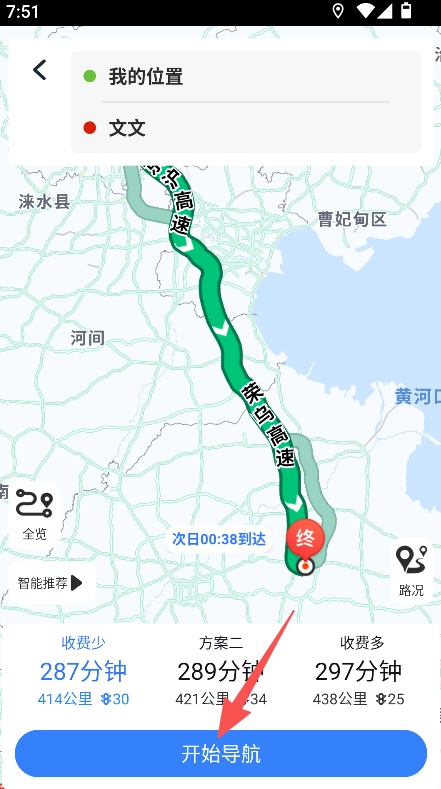 2、导航规划细致,可规划不同路线方案,展示距离、时间、收费情况,让用户选择最优行程。