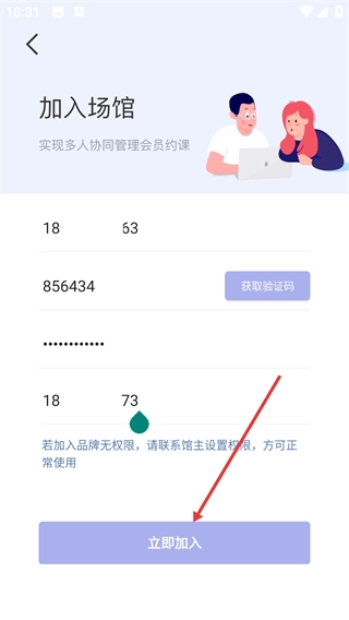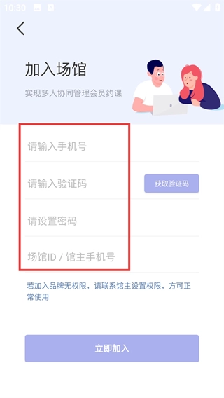 3、在加入场馆的界面中,输入手机号、验证码、密码以及场馆ID或馆主手机号。
