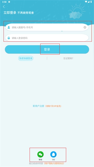 2、在登录页,可选择输入【圈号/手机号】与密码,或用【微信/QQ】快捷登录。