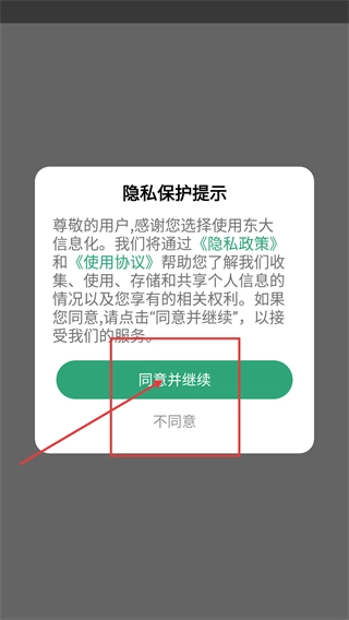 1、进入东大信息化相关服务界面,会弹出【隐私保护提示】,点击【同意并继续】按钮以接受服务。