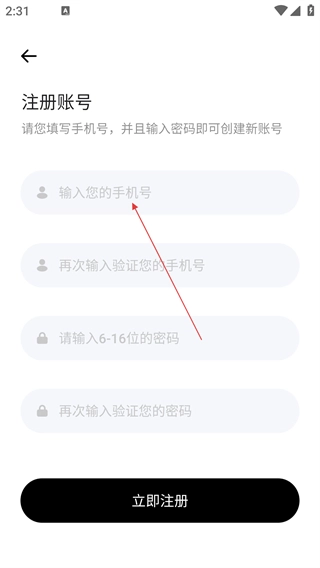 4、进入注册账号页面后,依次填写手机号、完成手机号验证并设置密码,随后点击【立即注册】按钮,即可完成账号注册操作。