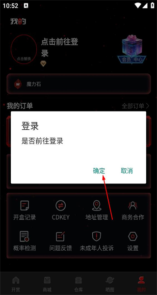 3、弹出登录确认弹窗,显示是否前往登录的提示,点击确定按钮,进入吉利魔盒的登录界面。