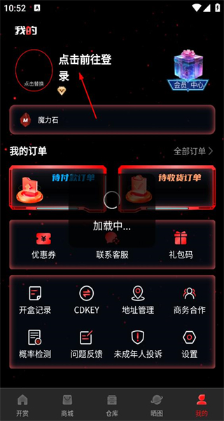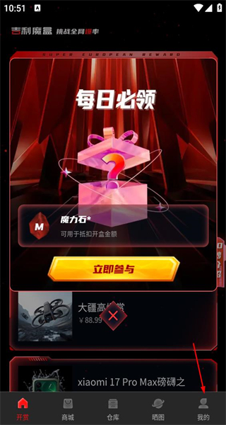 1、打开软件后,首页有每日必领活动及魔力石奖励,点击底部我的选项,进入个人中心页面。