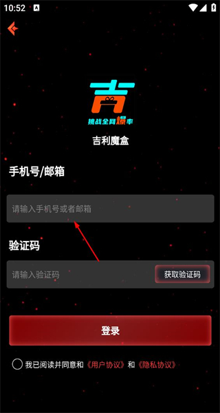 4、进入吉利魔盒登录界面,看到手机号邮箱输入框、验证码栏及登录按钮,准备填写信息完成登录。
