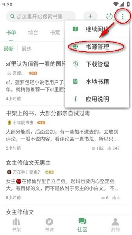 1、打开搜书大师后,点击首页右上方的三点选项,选择“书源管理”,如图所示;