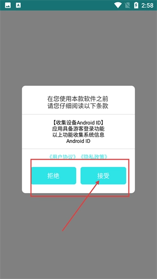 1、在软件使用前的条款弹窗中,需阅读含【收集设备Android-ID】的内容,点击【接受】按钮继续流程。