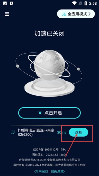 2、进入显示【加速已关闭】的界面,可点击【点击开启】,还能选择【[10][腾讯云]直连→南京-02(6200)】线路并点【选择】。