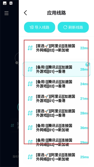 3、进入【应用线路】页面,可通过【导入线路】【刷新线路】管理线路,选择如【[首选][阿里云][连接国外网络][02]→新加坡】等线路。
