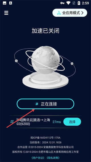 4、界面显示【正在连接】状态,当前线路为【[04][腾讯云]直连→上海-02(6200)】,可通过【选择】按钮切换线路。