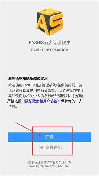 在使用【EASHIS酒店管理软件】前,您需要仔细阅读服务条款与隐私政策,只有点击【同意】按钮后,才能进入软件的后续操作界面。
