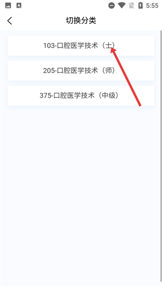 在切换分类的界面中,可以选择像【103-口腔医学技术(士)】这类分类,点击该分类就能切换至对应的考试类别。