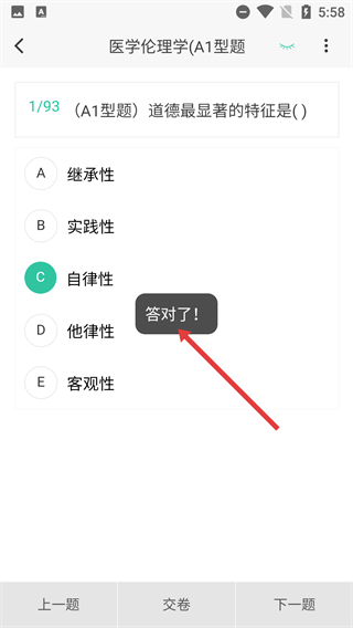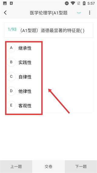 3、进入答题界面后,若看到类似【(A1型题)道德最显著的特征是】这样的题目,可从A至E对应的选项中选择答案进行作答。