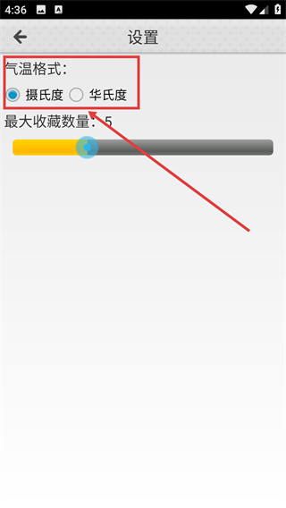 3、进入设置页面后找到【气温格式】这一选项,然后选择【华氏度】。