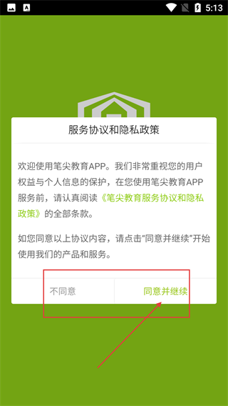 1、打开应用后,需仔细阅读《服务协议和隐私政策》,点击“同意并继续”按钮,就能进入应用界面。