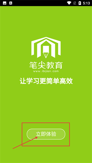 2、打开应用后进入启动页,页面上会显示“笔尖教育-让学习更简单高效”的标识,点击页面中的【立即体验】按钮,就能进入到后续的登录或注册环节。