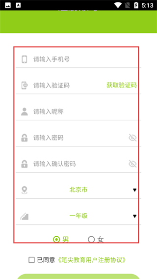 4、进入注册页面后,需要填写手机号、验证码、昵称、密码等信息,同时选择所在地区、对应的年级以及性别,在勾选相关协议后就能完成注册流程。