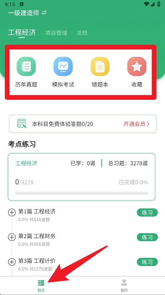 4、在题库界面中,提供历年真题、模拟考试、错题本和收藏功能,用户可自由切换进行针对性学习和巩固复习。