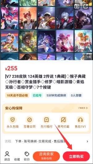 4、在确认购买后点击“立即购买”按钮,就能完成账号交易并获取账号资料。