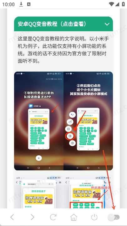 小团团语音盒软件具备悬浮窗功能,只要授予相应权限,它就能显示在手机桌面的最上层,这样大家就能随时开启或者切换语音包了。另外,该软件还带有变声功能,要是有小伙伴不清楚如何变声,可以查看软件里提供的详细教程步骤哦!