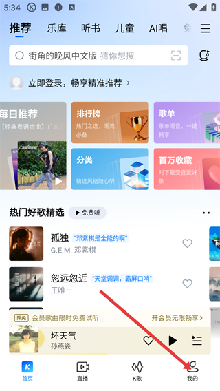 1、打开酷狗音乐首页后,点击页面右下角的【我的】图标,即可进入个人页面。