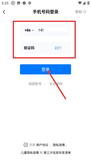 4、进入手机号码登录页面后,依次输入手机号与验证码,勾选同意相关协议,最后点击【登录】按钮即可完成登录操作。