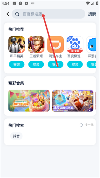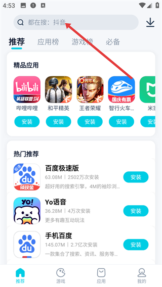 1、在应用商店的主界面中,点击顶部的搜索栏,进入可输入搜索内容的状态。