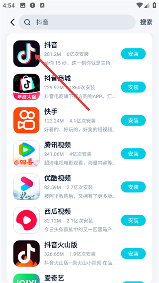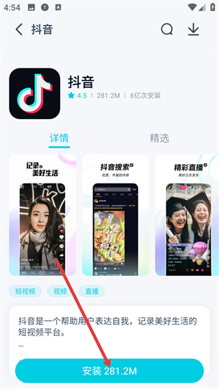 4、进入抖音应用的详情页面后,找到并点击显示为【安装281.2M】的按钮,即可启动抖音应用的安装流程。