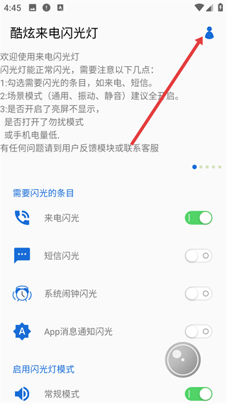 1、打开酷炫来电闪光灯应用,在主界面点击右上角的人物形状图标,即可进入设置页面。