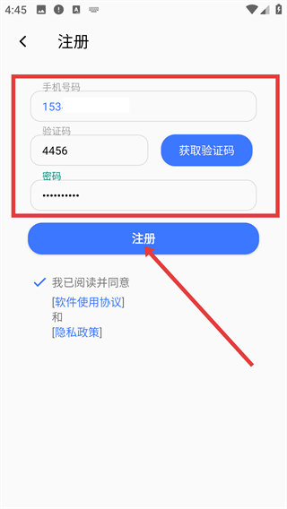 4、在注册页面输入手机号、验证码【4456】以及密码,勾选同意【软件使用协议】和【隐私政策】这两项,随后点击【注册】按钮即可完成注册流程。