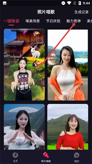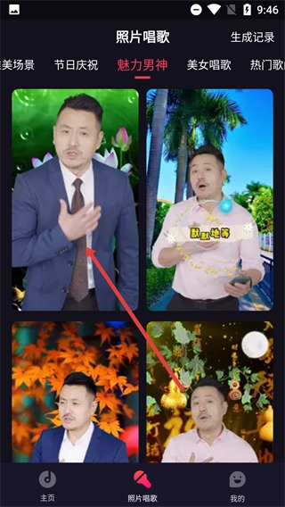 2、在照片唱歌页面点击【魅力男神】分类标签,即可进入该分类的模板列表页面。