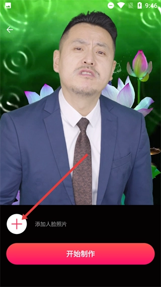 4、进入模板制作界面后,找到并点击【添加人脸照片】旁的加号按钮,添加照片完毕后,点击【开始制作】,即可完成照片唱歌内容的制作。