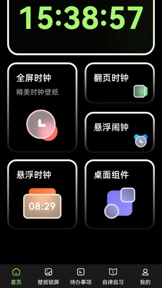 打开应用首页后,能够直接挑选全屏时钟、翻页时钟或者悬浮闹钟来添加到桌面。